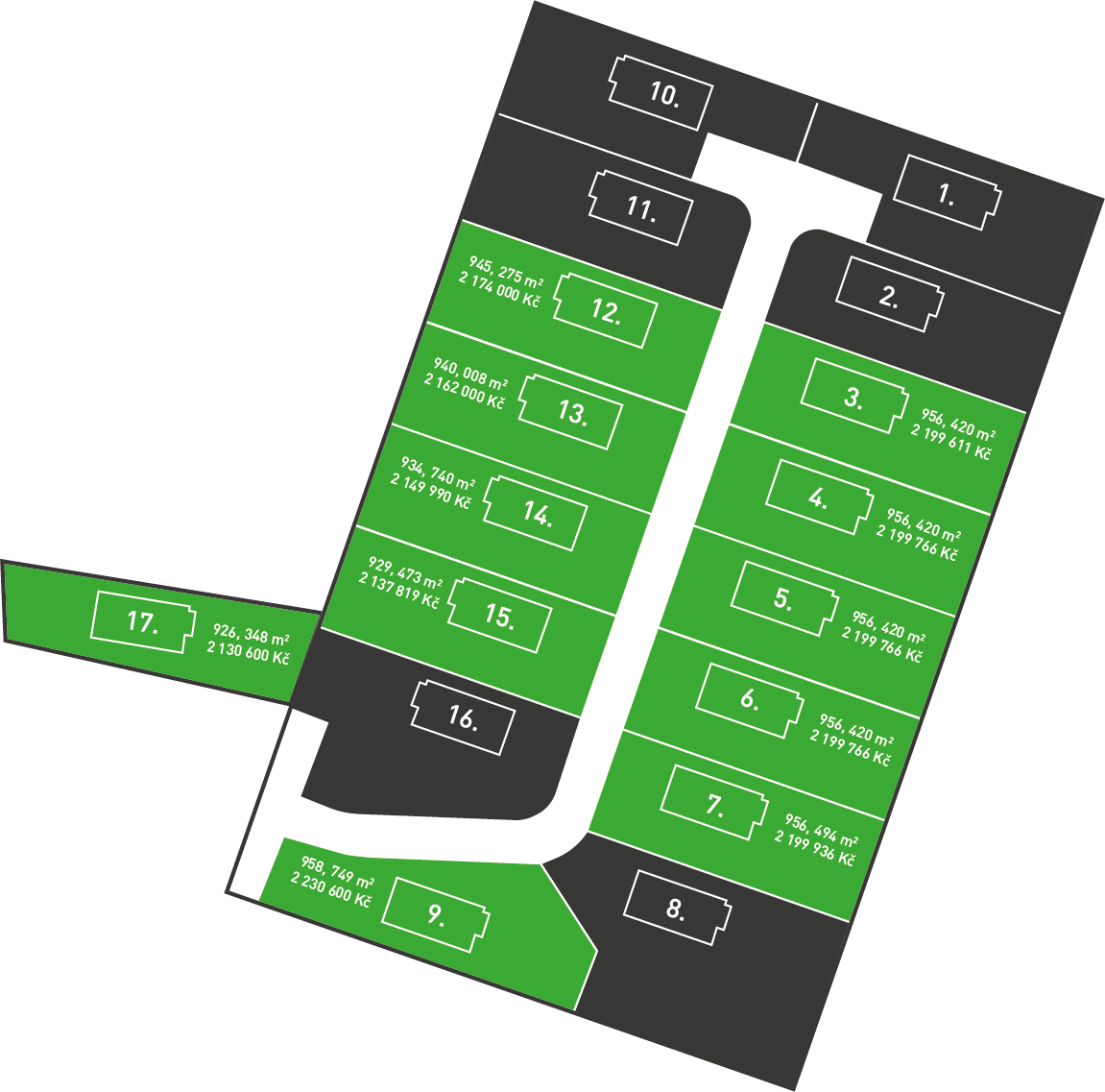 - Cena – zasíťované parcely nabízíme za atraktivní cenu 2400 Kč/m² včetně DPH (v ceně zasíťované parcely je i projekt rodinného domu se zajištěným stavebním povolením!)